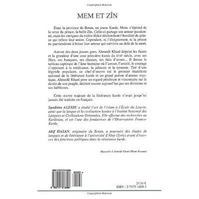 Dans la province du Botan, un jeune kurde, Mem, s'éprend de la soeur du prince, la belle Zîn. Celle-ci partage son amour passionnée, mais les intrigues du traître Bekir déclenchent l'hostilité du prince qui refuse leur union. Autour des deux jeunes gens, Ahmedê Khanî dépeint les fastes et la grandeur d'une cour princière kurde du Xviiè siècle, avec ses fêtes, ses banquets, ses chasses, ses faits d'armes. . .Tiré d'une légende populaire, ce chef-d'oeuvre est le premier manifeste national de la littérature kurde et un grand poème d'amour mystique.